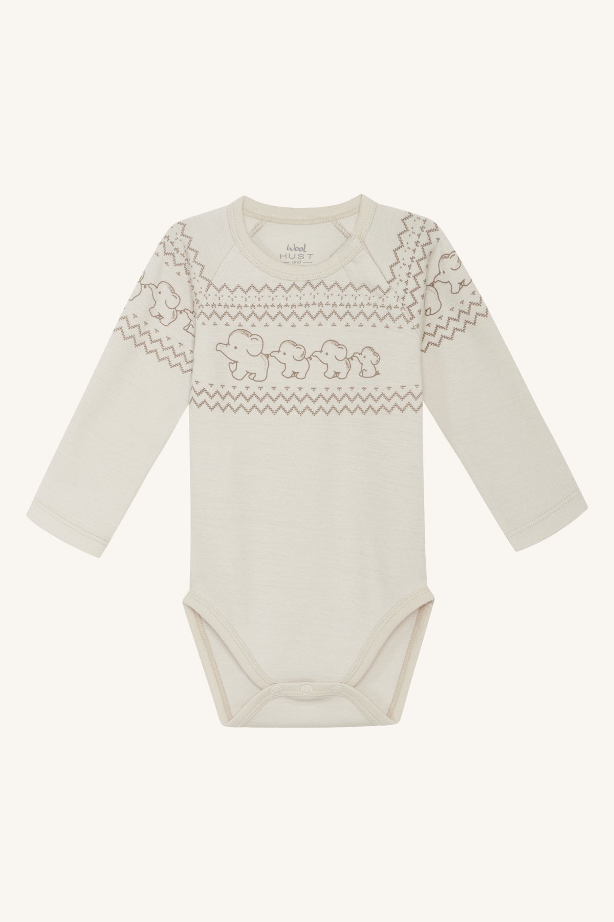 Warmer, dehnbarer Body aus Merinowolle. Regulierendes und hautfreundliches Material. Mit einem schönen grafischen Print und kleinen Elefanten bedruckt. Mit schräg verlaufenden Druckknöpfen an der linken Schulter. Praktische Druckknöpfe im Schritt.
