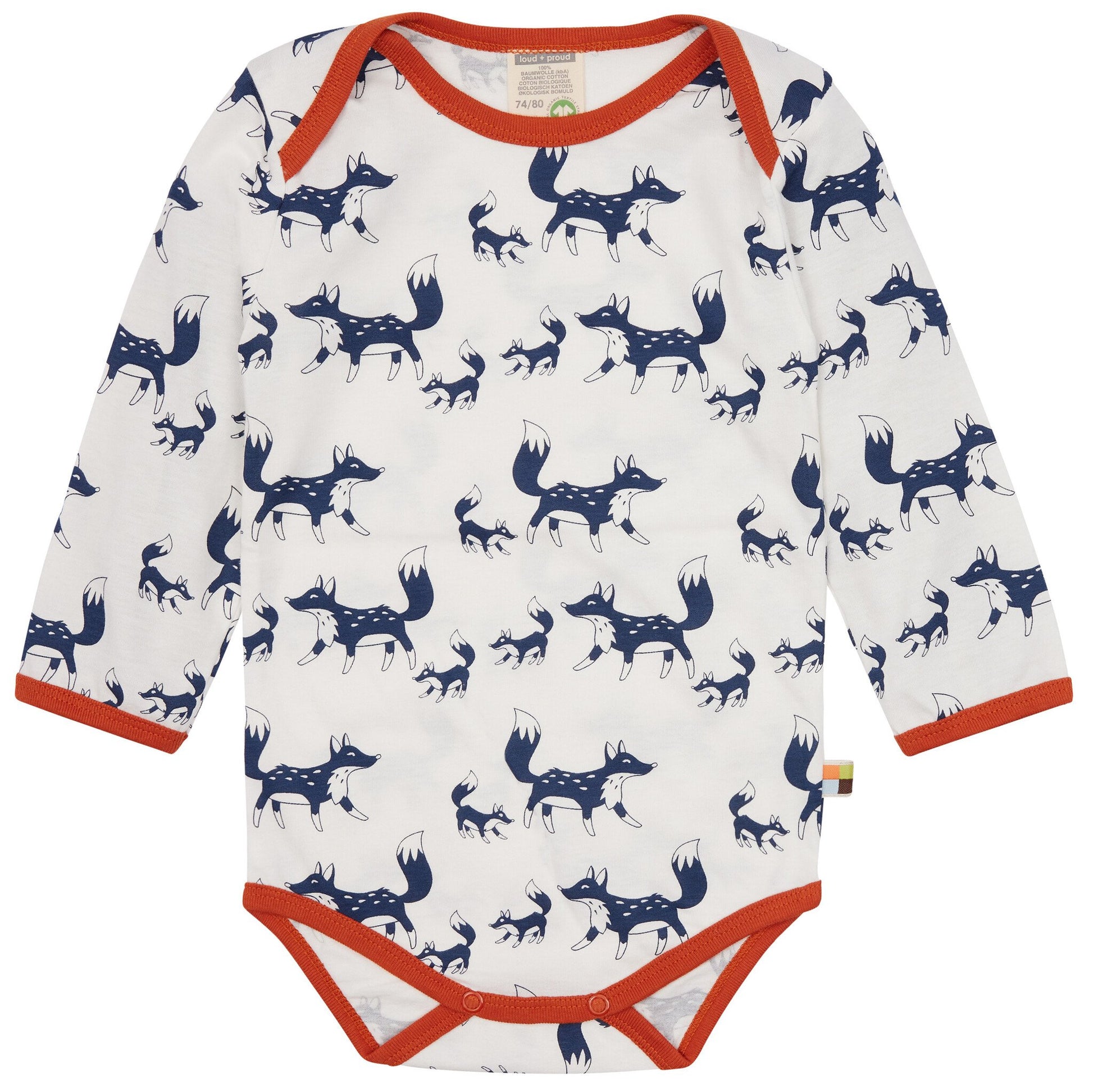 Frecher Body mit aufgedruckten Füchsen. Aus weicher, GOTS zertifizierter Biobaumwolle. Die Kanten sind mit einer Kontrastfarbe eingefasst. Schlupfausschnitt für einfaches Umziehen und Schrittverschluss mit 2 Druckknöpfen. Von der Marke Loud and Proud. Fähnchen an der Seitennaht.