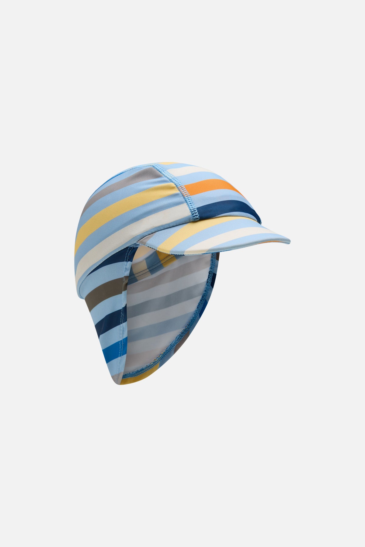 Bademütze mit Streifen. Verfügt über eine vordere Krempe und ist hinten länger. Die Mütze hat einen UV50+/UPF50-Filter. Dieses Produkt besteht zu 83 % aus recyceltem Polyester. Dieses Produkt ist Oeko-Tex 100®-zertifiziert. Von der Marke Hust and Claire.