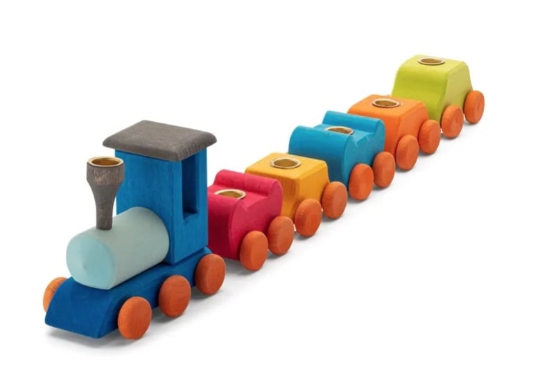 Fröhlicher Zug für den Geburtstagstisch. Aus Lindenholz gefertigt und mit Messing-Metalleinsätzen für Geburtstagskerzen und Geburtstagsstecker. Der Zug ist 45 cm lang und mit 5 Waggons bringt er dem Geburtstagskind viele leuchtende Geburtstagsgrüsse. Die sechs Löcher in den Holzwaggons und im Rauchfang der Dampflokomotive sind mit Metall-Kerzenhaltern versehen und haben einen Durchmesser von 1,4 cm.