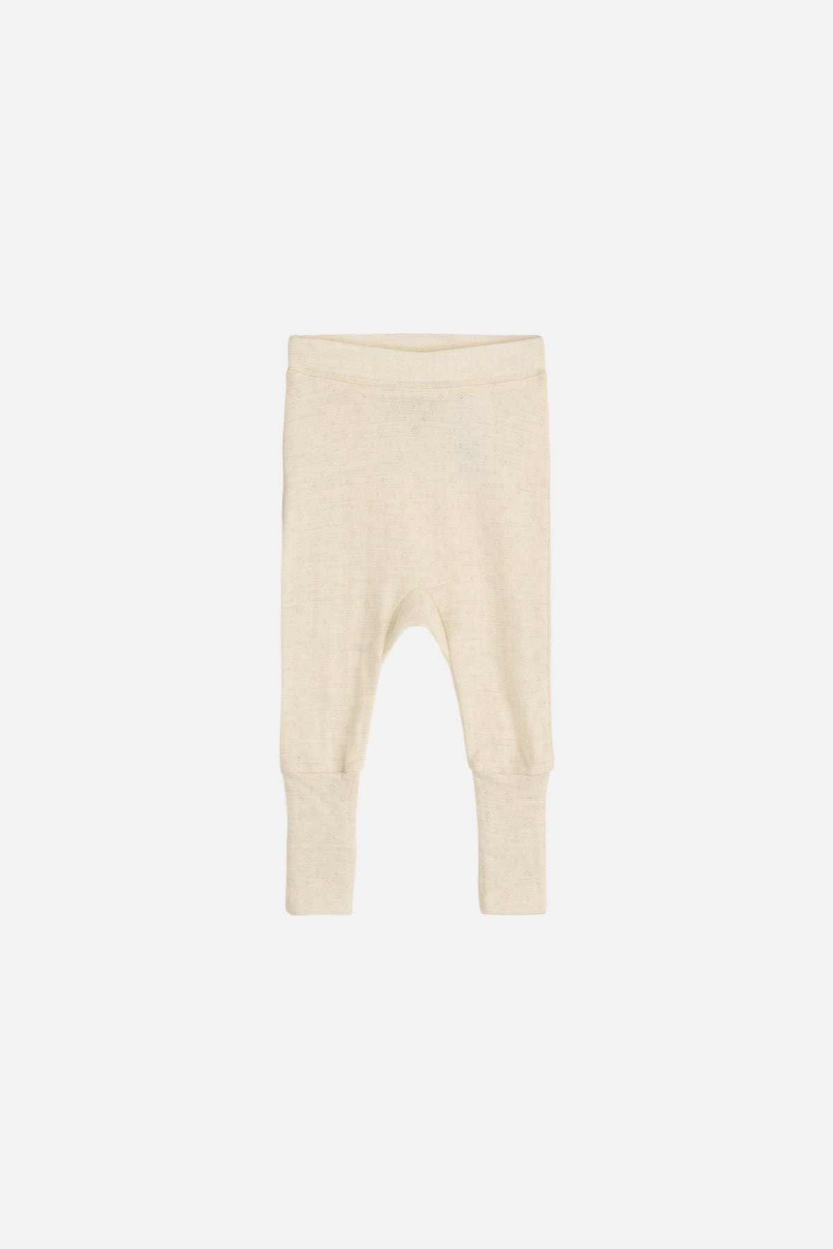 Hose aus Wolle/Seide von der dänischen Marke Hust and Claire. Die Hose hat einen luftigen Schnitt und elastische Bündchen. Die Füsse können bis zur Grösse 86 umgeklappt werden. Das Material gleicht die Körpertemperatur sehr gut aus. Mit einem Pointelle-Muster (die Hose hat im Material Löchli als Muster).