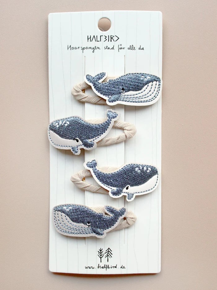 Haarspangen sind für alle da! Schöne Wal-Haarspangen im 4er Set. Hochwertige Wal-Stickerei und handummantelte Spange, so dass nichts ziept und zwickt. Auch als kleine Geschenkidee hübsch. Von der Marke Halfbird.