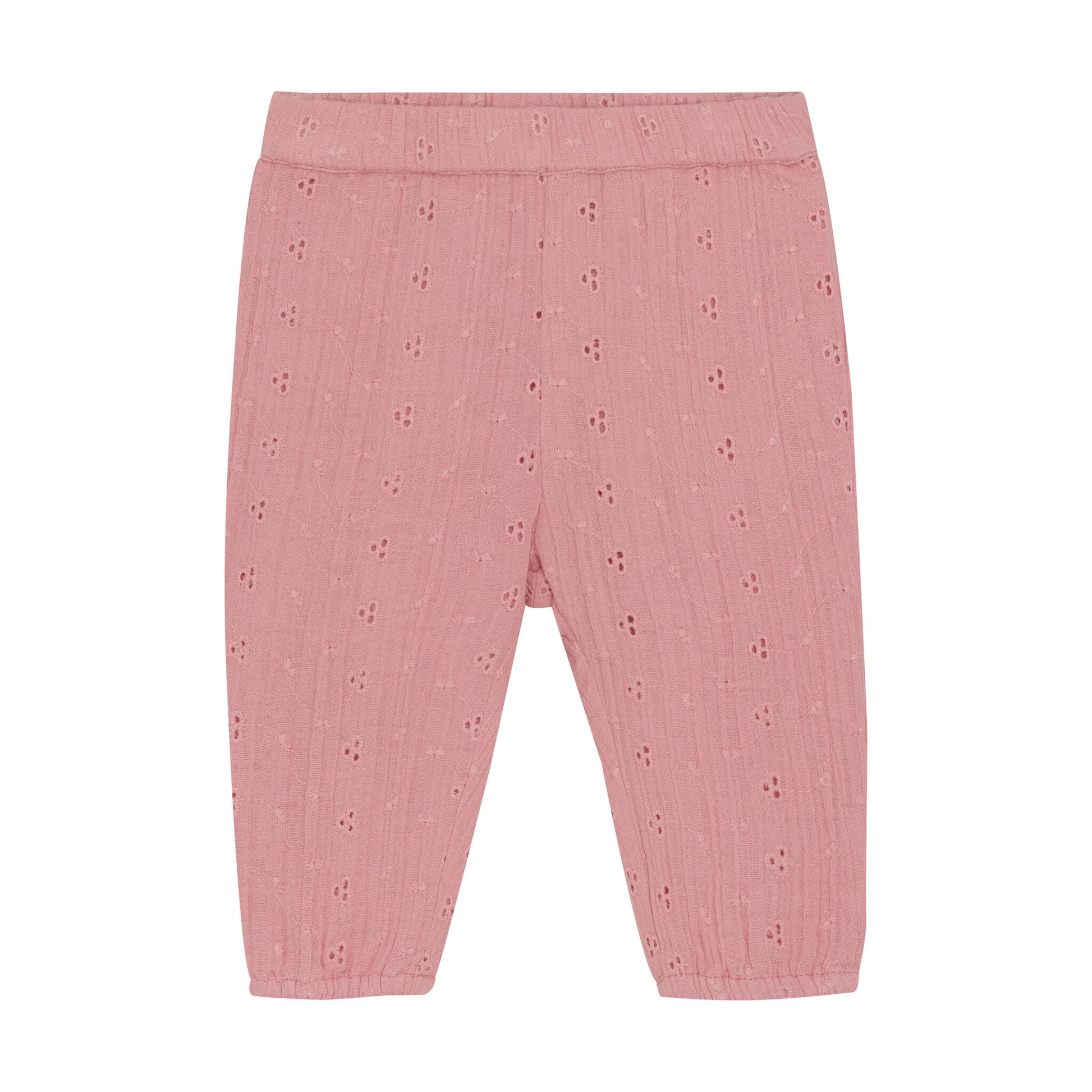 Lässige Musselinhose versehen mit einer Lockstickerei. Die Bündchen sind dehnbar und haben einen Gummizug. Doppellagig gewebt. Besonders weich und angehen auf der Haut. Von der dänischen Marke Minymo.
