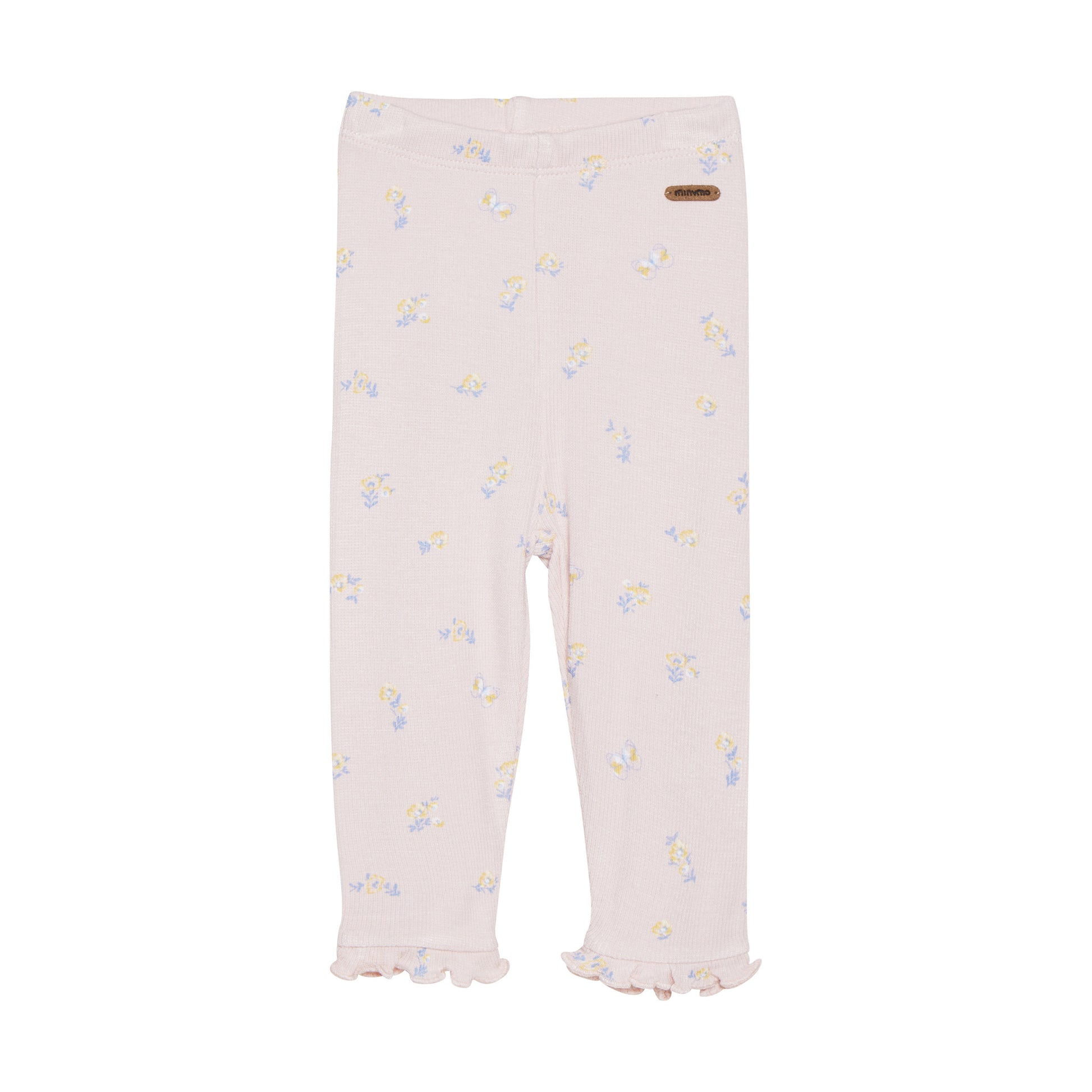 Romantische Leggings mit Blumen und Schmetterlingen bedruckt. An den Beinenden befinden sich Rüschen. Fein gerippt und aus dem sehr weichen und leichten Material Bambusviskose. Perfekt für den Sommer.