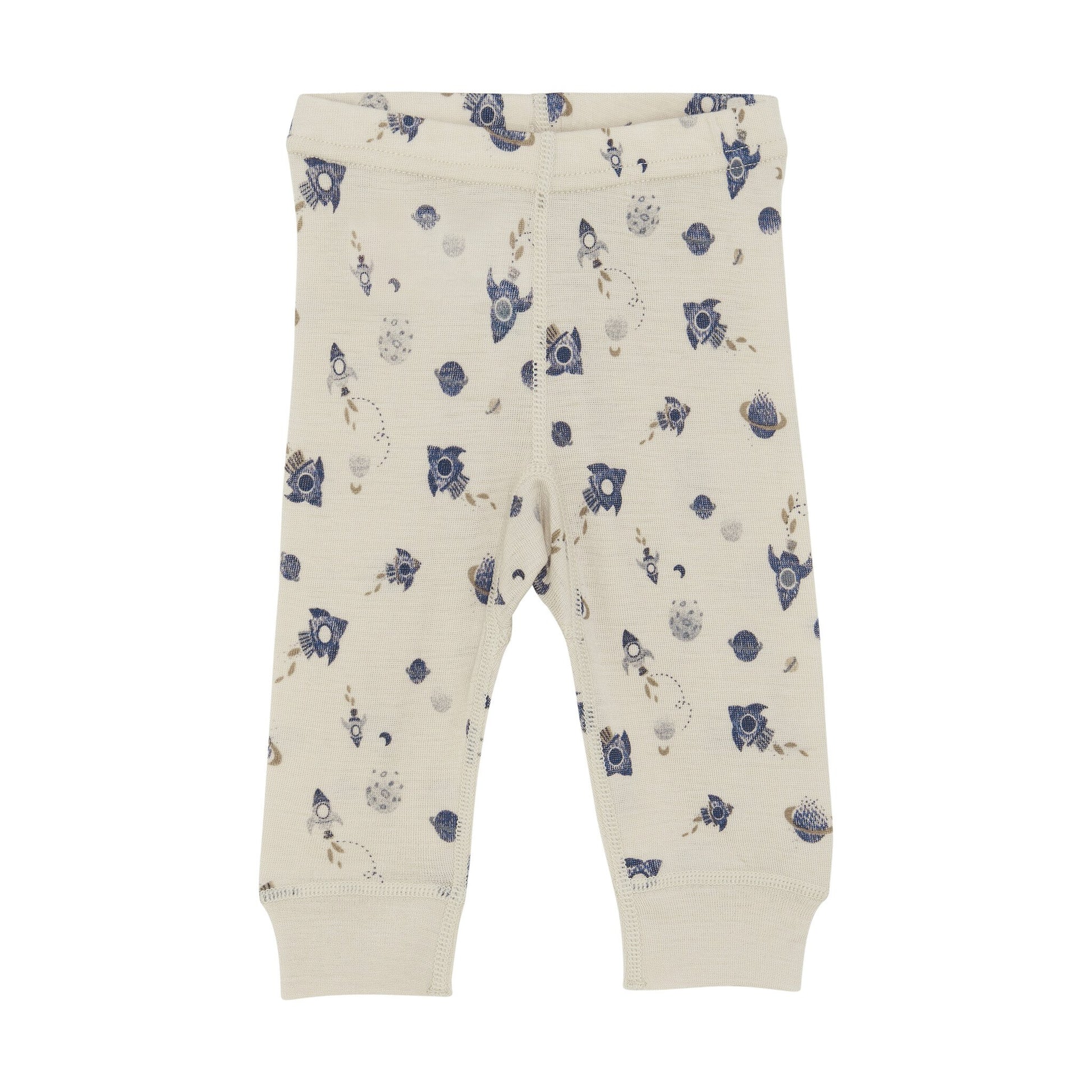 Leggings aus weicher Merinowolle. Mit Raketen und Planeten bedruckt. Der Bund ist elastisch. Wolle gleicht die Körpertemperatur hervorragend aus, ohne die Wärme zu stauen. Sie ist fast ganzjährig tragbar.