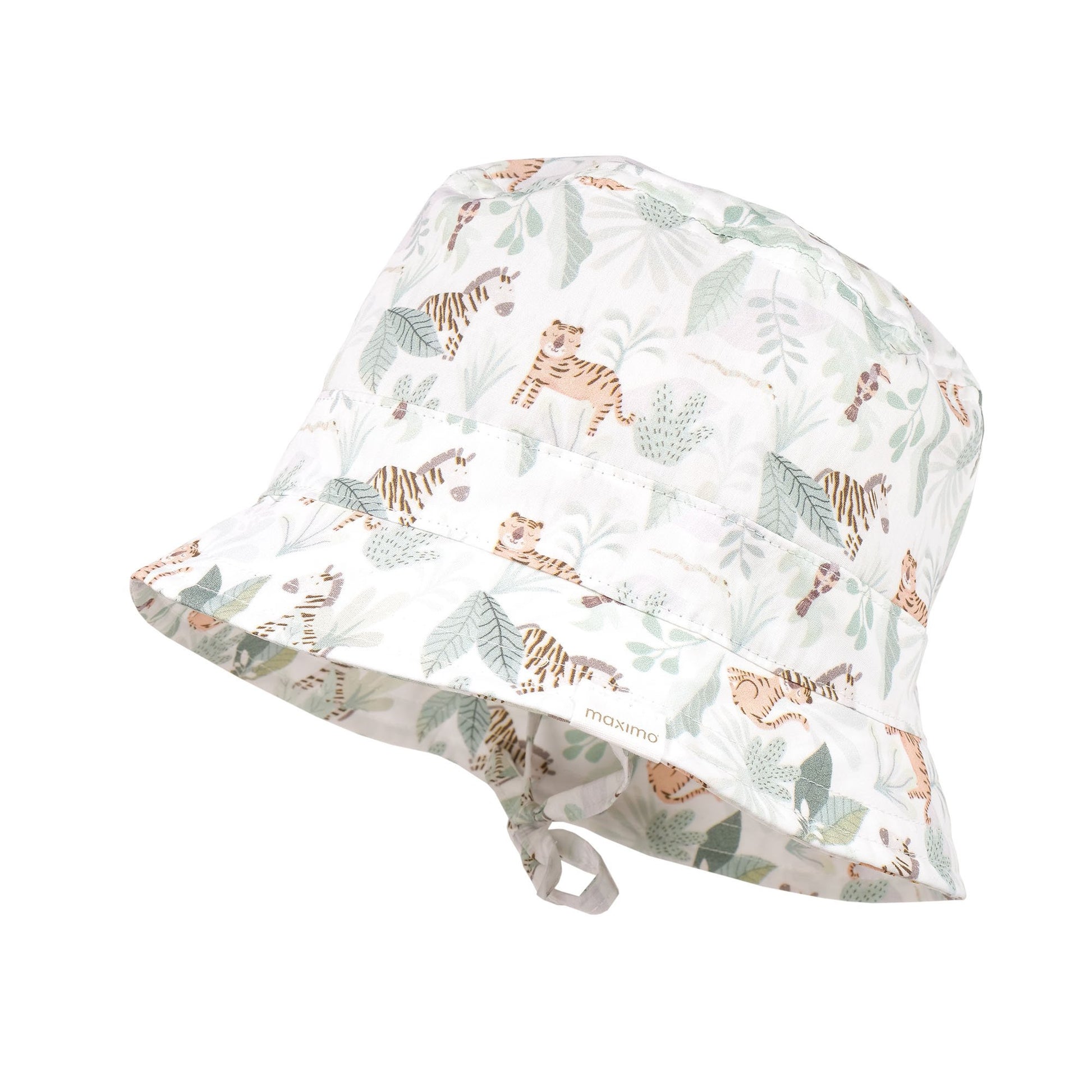 Luftiger Fischerhut von maximo. Der Hut ist mit Tieren und Pflanzen bedruckt. Er hat eine hohen UV-Schutz von UPF 50+. Mit Bindeband. Dieses kannst du übrigens auch gut abschneiden, wenn es stören sollte. Der Sonnenhut ist aus leichter Baumwolle gewebt. Ein toller Begleiter für sonnige Tage.
