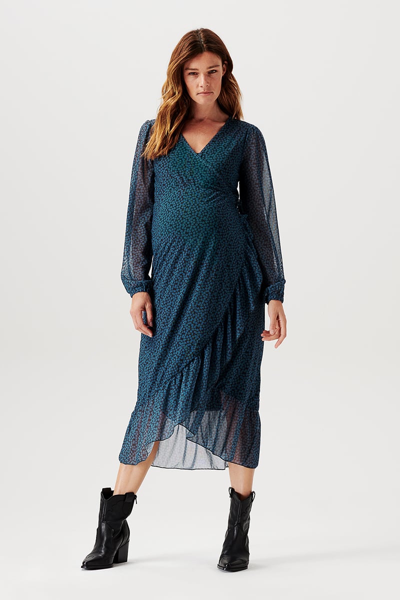 Still- und Umstandsmaxikleid von der Marke Noppies. Das Kleid ist aus einem geschmeidigen Mesh-Gewebe gefertigt. Das Wickelkleid passt sich deiner Figur perfekt an. Mit Rüschen und transparenten Ärmeln. Für den Alltag oder festlich kombiniert.