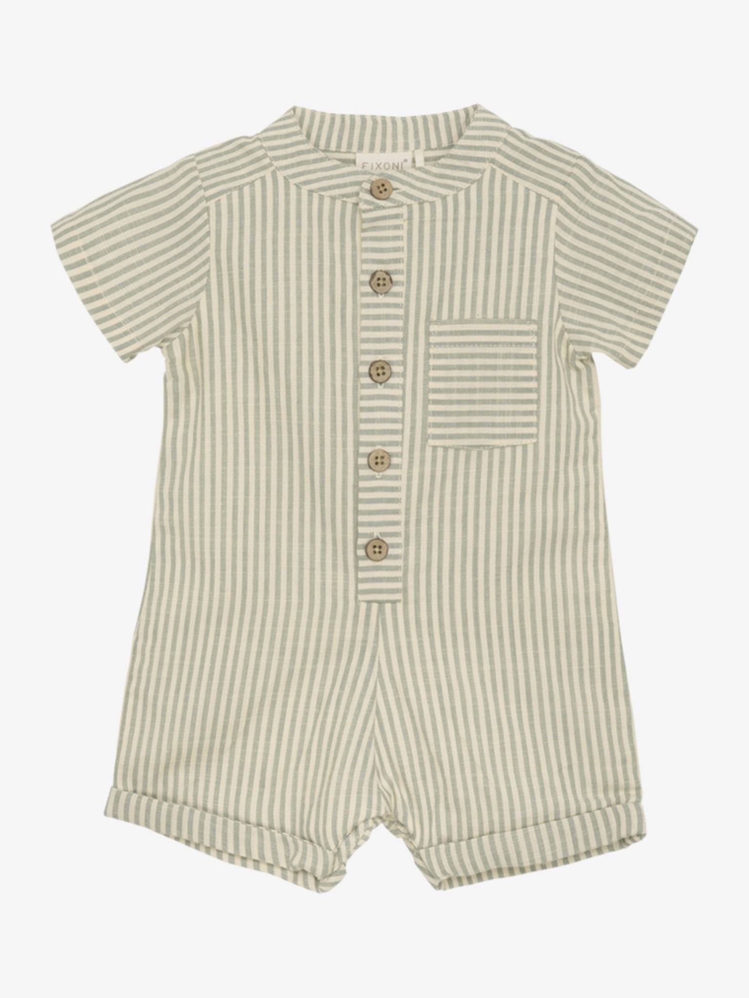 Strampler aus luftiger, weicher und leicht gewebter Biobaumwolle. Mit dekorativen Holzknöpfen und Druckknöpfen im Schritt. Herrlich für den Sommer. Von Fixoni.