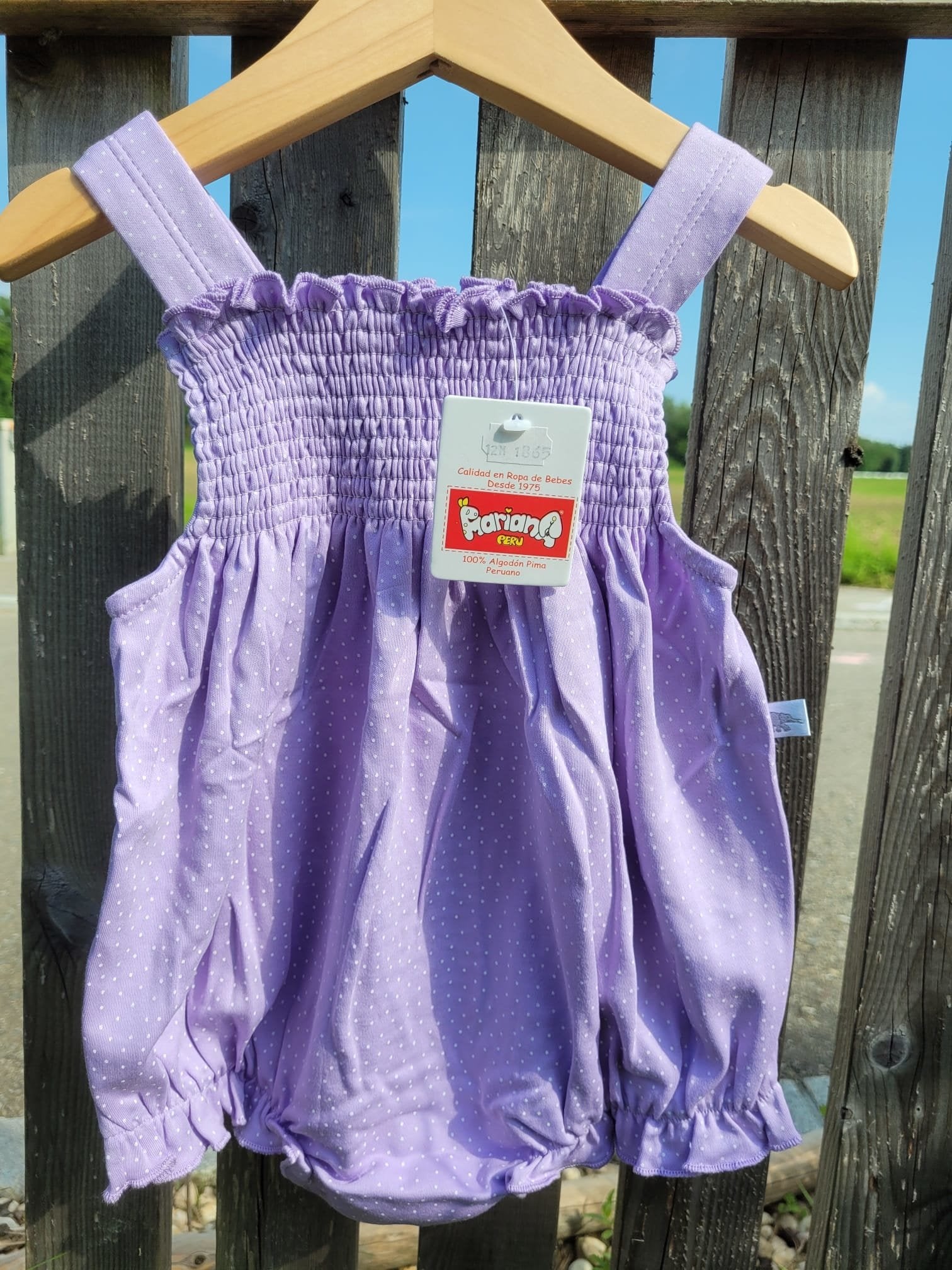 Lila Strampler mit weissen Pünktchen. Für die heissen Sommertage. Mit einer elastischen Raffung über dem Brustbereich. Mit Knöpfen im Schritt. Aus geschmeidiger Pima Baumwolle. In Peru hergestellt.