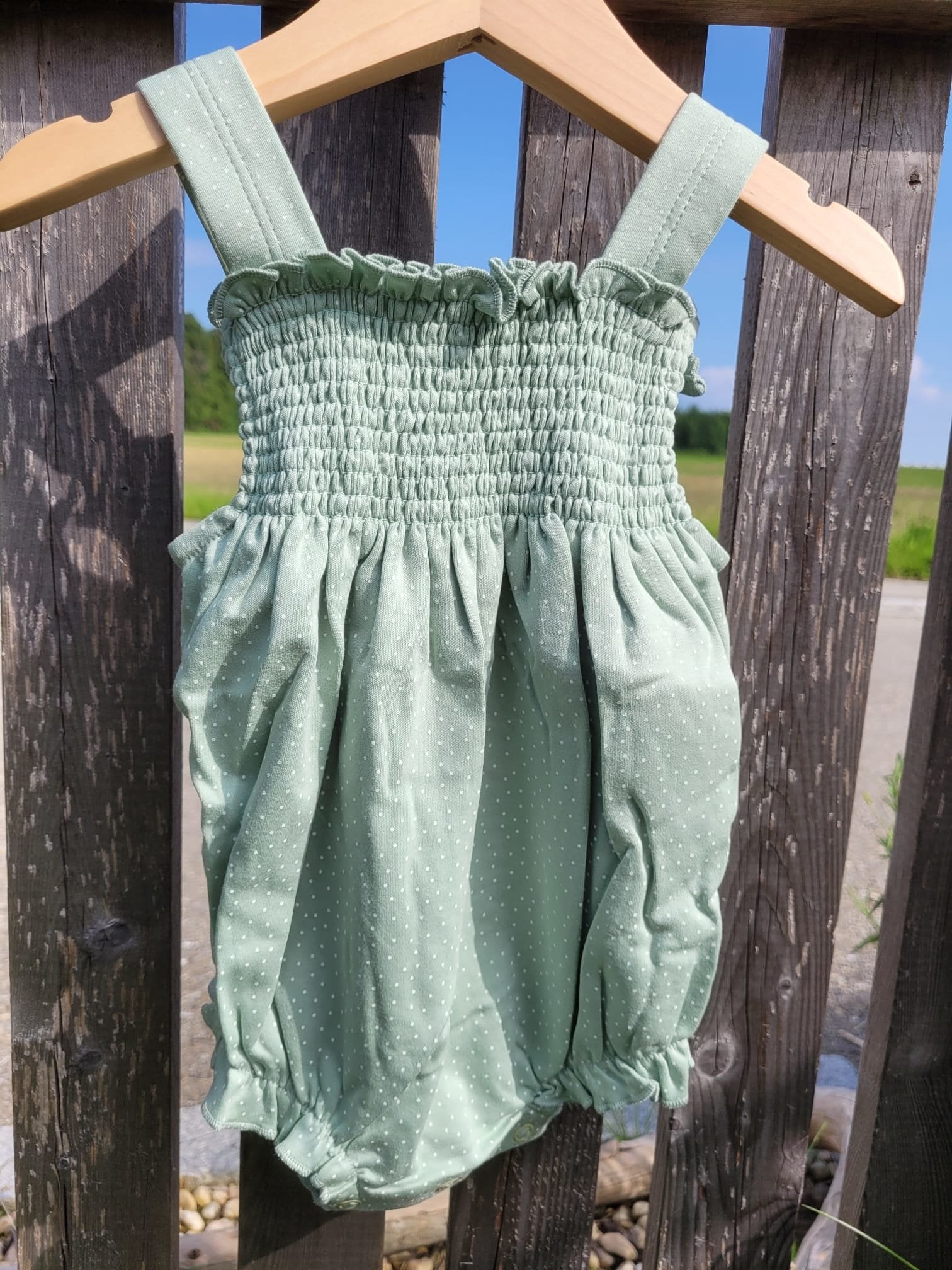 Olivgrüner Strampler mit weissen Pünktchen. Für die heissen Sommertage. Mit einer elastischen Raffung über dem Brustbereich. Mit Knöpfen im Schritt. Aus geschmeidiger Pima Baumwolle. In Peru hergestellt.