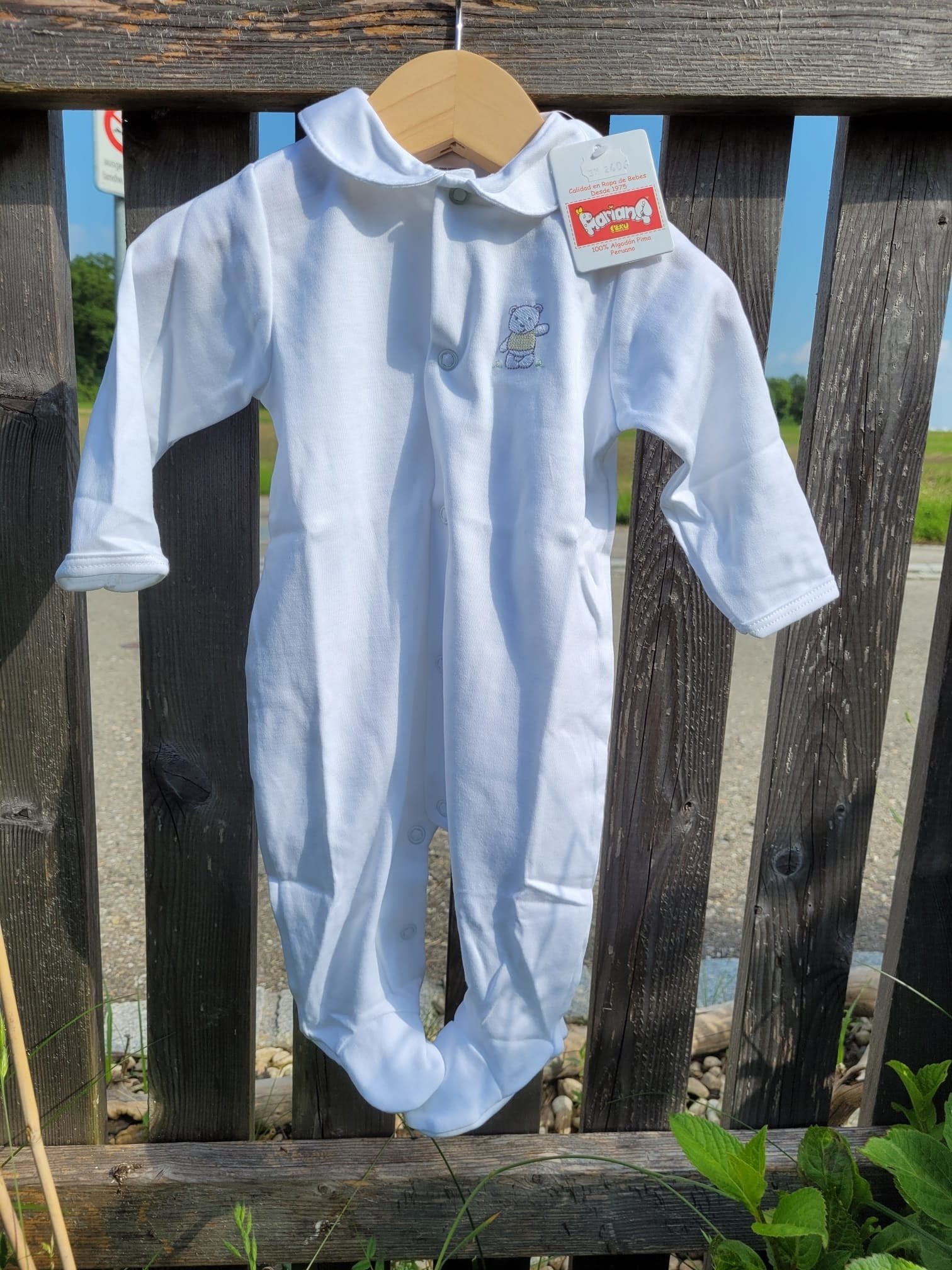 Weisser langarm Strampler mit abgerundetem Kragen. Im Brust- und Schrittbereich befinden sich Druckknöpfe. Auf der linken Brust ist eine herzige Bärenstickerei aufgestickt. Aus geschmeidiger Pima Baumwolle. In Peru hergestellt. Von der Marke Mariana.
