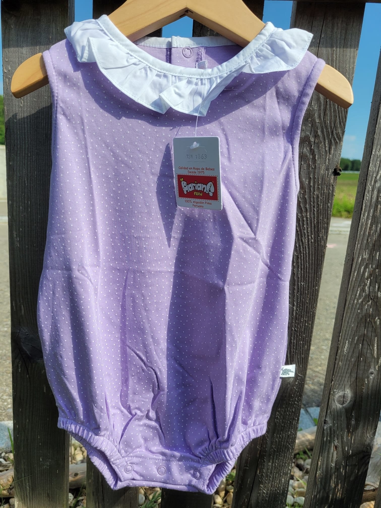 Süsser Strampler von der Marke Marina. Aus geschmeidiger Pima Baumwolle. Lila mit weissen Pünktchen. Im Rückenbereich befinden sich für leichteres An- und Abziehen ein paar Druckknöpfe. Der Rüschenkragen macht den Strampler besonders elegant. Dehnbare Beinabschlüsse und Druckknöpfe im Schritt. Hergestellt in Peru.