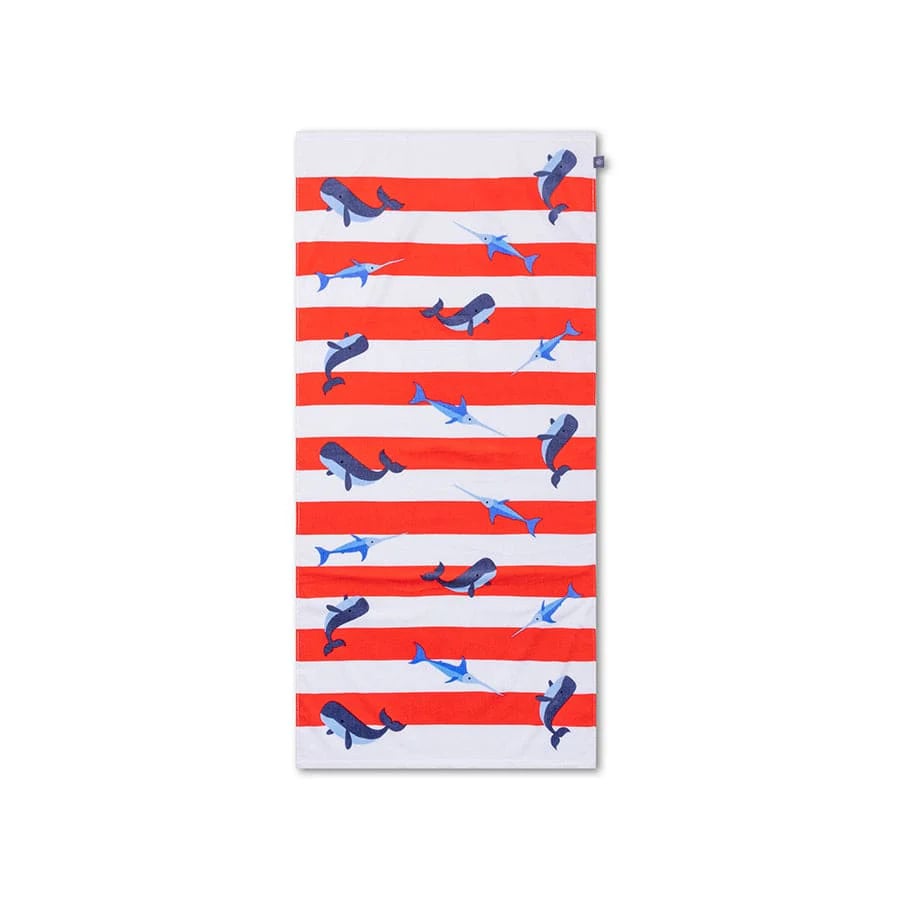 Weiches Strandtuch aus Baumwolle. Das Tuch "Ozean" ist rot/weiss gestreift und mit Walen und Schwertfischen bedruckt. Es hat die Masse 135 x 65 cm. Das Tuch ist frei von schädlichen Chemikalien. Von der Marke Swim Essentials. In den Niederlanden designed.
