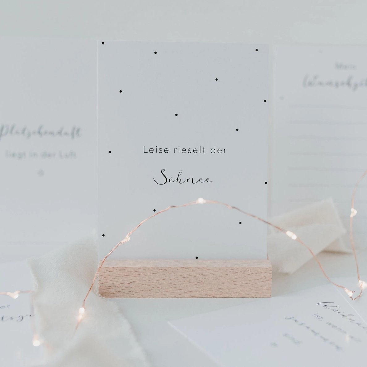 Vorfreudige Weihnachtskarte "Leise rieselt der Schnee". Da kommen Kindheitserinnerungen hoch. Schlicht und trotzdem besonders, die Karte im Format A6 auf hochwertigem und schön dickem Papier gedruckt. Für dich selbst zur Dekoration oder zum Schenken.